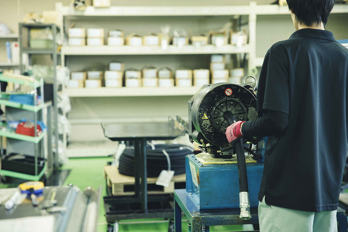 高圧ホースは建設機械・農業機械・工業機械などの油圧を動力する機械で力を伝達するうえで不可欠な製品です。松永工場は、住友理工の高圧ホースアセンブリ工場として、組立作業を行っています。